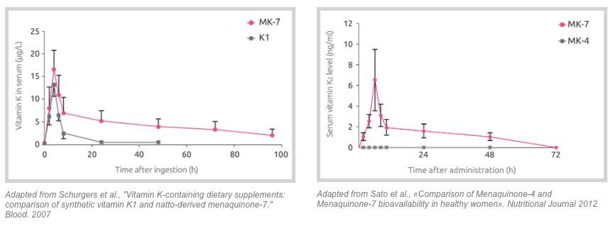 維生素K2的長鏈甲萘醌-7比甲萘醌-4在人體中表現出更高的活性。 MK-7比其他同系物有更高的功效是由 於它的更好的生物利用度和更長的半衰期。 MK-7因此是體內獲得維生素K最大效果的最佳來源。健康人群 激活體內骨鈣素需要維生素K2(MK-7)的最小劑量是45微克/天;而MK-4需要的最小劑量是1500微克/天。